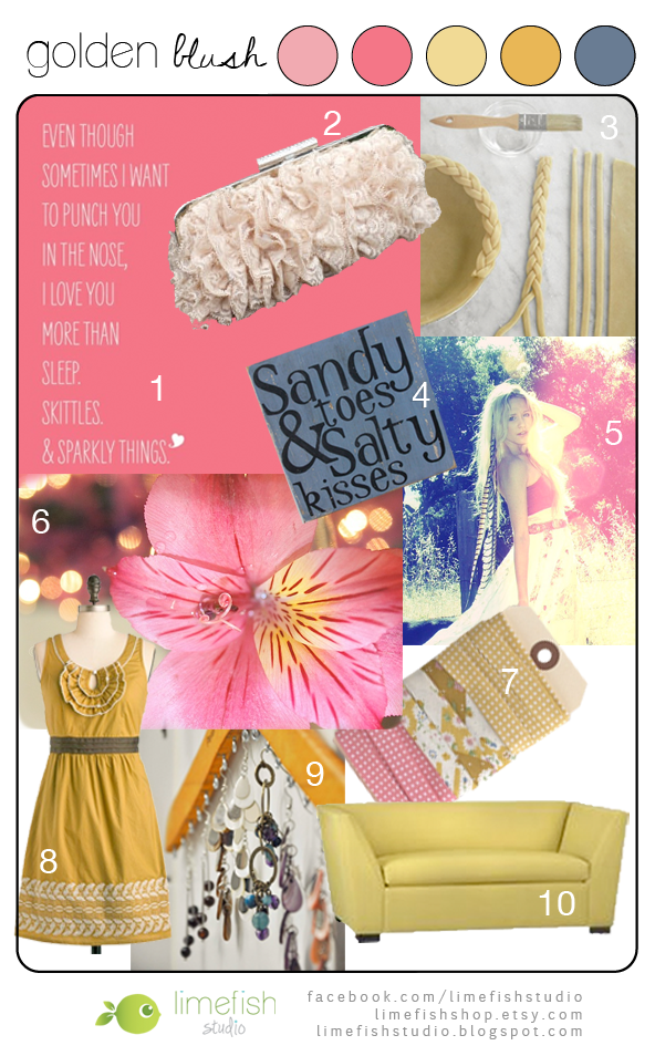 I am excited to share another set of color trends for summer. This board offers a bit of frill, sparkle and warmth while showcasing some amazing finds! The day after creating this, without even realizing, I walked out the door in navy shorts, a pink top, and gold jewelry…. I had a good laugh a few hours later when it dawned on me. Enjoy! Hopefully this will inspire you as well!