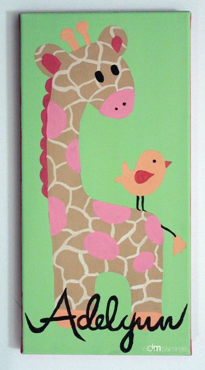 After the set was complete and almost ready to ship off, I got another nursery request…. she sent the bedding link ~ and ta-da, it was the same bedding! The only difference was this one was for a little girl’s room (in VA).  You’ll also notice the boy’s room painting set is a bit more complex (they had a larger wall space to cover and a larger budget).  I am always willing to work with any space, theme, and budget!  My custom paintings have also been very popular for Baby Shower gifts! You can either wait to figure out the theme and baby’s name, or I you can even purchase a gift certificate and allow the new mom to choose her own paintings. Feel free to contact me with questions or ideas!