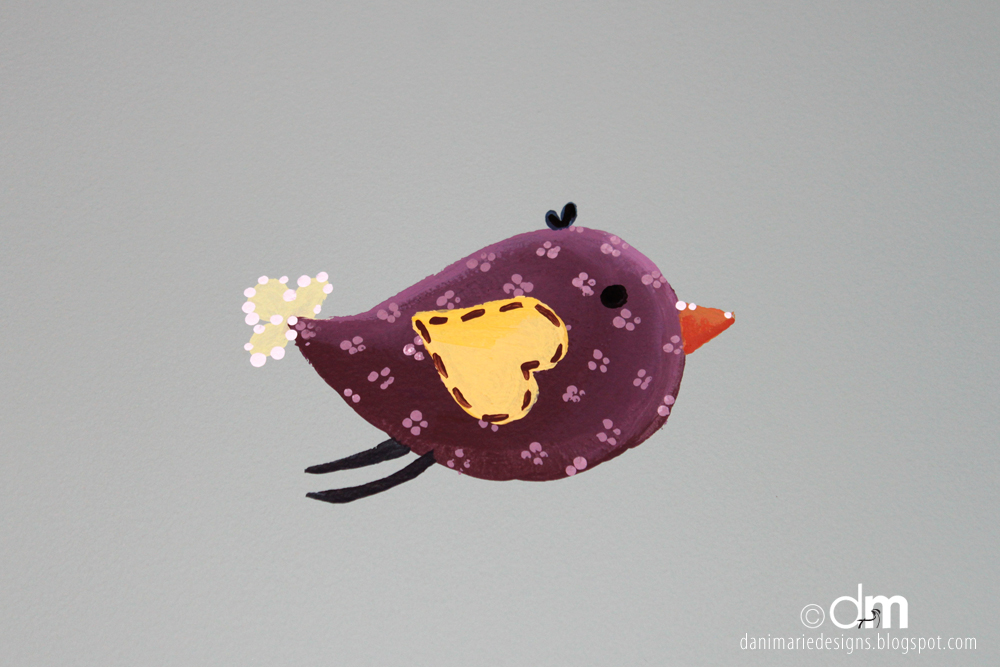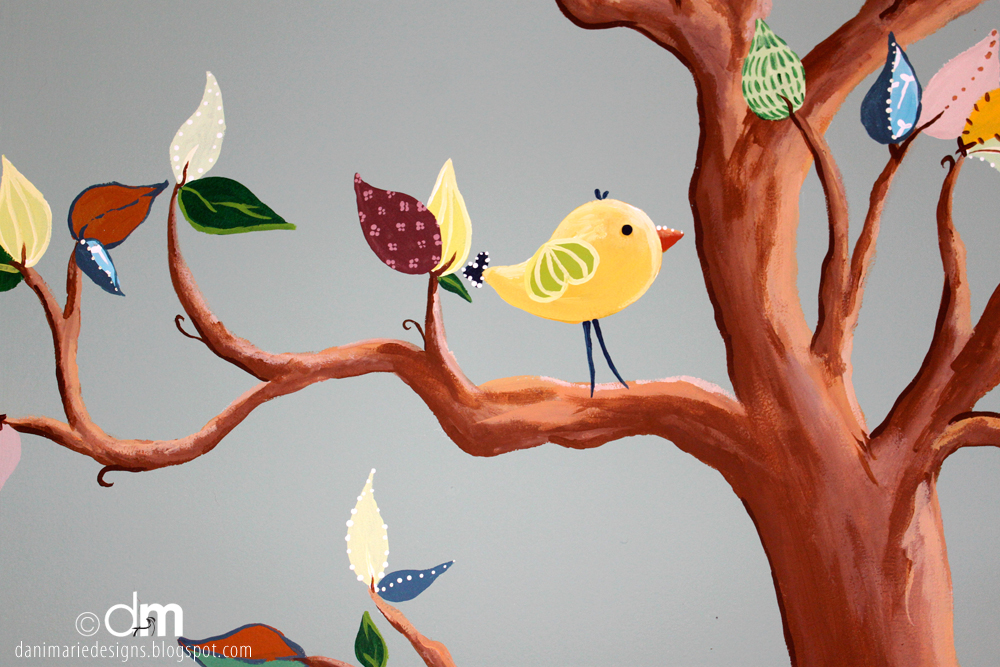 The mom originally thought of buying a wall decal, but after brainstorming we decided having a more personalized tree would be more meaningful and a bit less static. She wanted a fairly realistic “whimsical” tree with leaves that almost resembled scrapbook paper ~ what a fun and adorable challenge! To create a more sentimental level, I actually pulled colors and patterns from various fabrics, toys, and artwork around the room. I have to admit the purple pattern is my favorite (shown on the bird below). It came from a precious artwork/photo collage that hangs on the opposite wall. Some of the colors in the photos below are a bit off (the last two are probably the closes to the correct wall color… which was a beautiful blue green). After two different painting sessions and countless chats about which leaf was our favorite, the nursery was complete! I must say I am so proud of how it all turned out. I think it captures the parents’ sweet nature perfectly and will hopefully be a peaceful space to Baby D to enjoy for many years to come.