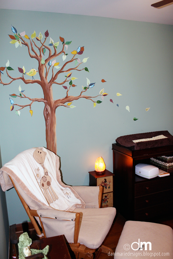 The mom originally thought of buying a wall decal, but after brainstorming we decided having a more personalized tree would be more meaningful and a bit less static. She wanted a fairly realistic “whimsical” tree with leaves that almost resembled scrapbook paper ~ what a fun and adorable challenge! To create a more sentimental level, I actually pulled colors and patterns from various fabrics, toys, and artwork around the room. I have to admit the purple pattern is my favorite (shown on the bird below). It came from a precious artwork/photo collage that hangs on the opposite wall. Some of the colors in the photos below are a bit off (the last two are probably the closes to the correct wall color… which was a beautiful blue green). After two different painting sessions and countless chats about which leaf was our favorite, the nursery was complete! I must say I am so proud of how it all turned out. I think it captures the parents’ sweet nature perfectly and will hopefully be a peaceful space to Baby D to enjoy for many years to come.