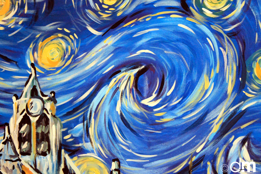 My first custom painting for 2012 was quite a unique request! The challenge was to combine Van Gogh’s Starry Night and Church at Auvers paintings while adding a twist from the show, Doctor Who. And, to include a strange alien in the church window (apparently this is from a particular episode). Although I’ve never seen the show, I was excited about the creative idea and love doing Van Gogh-style paintings.