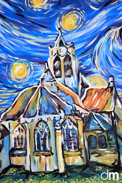 My first custom painting for 2012 was quite a unique request! The challenge was to combine Van Gogh’s Starry Night and Church at Auvers paintings while adding a twist from the show, Doctor Who. And, to include a strange alien in the church window (apparently this is from a particular episode). Although I’ve never seen the show, I was excited about the creative idea and love doing Van Gogh-style paintings.