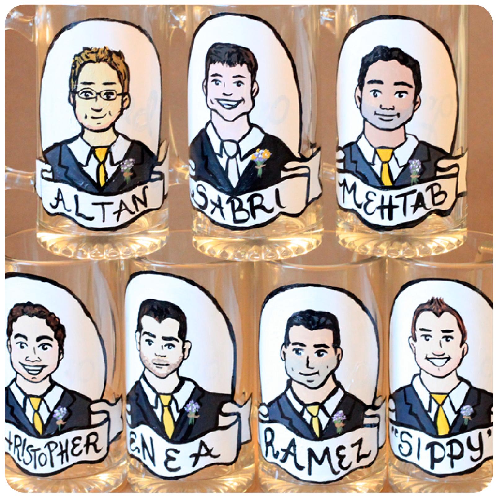 When I painted the first set of these groomsmen mugs for a friend’s May wedding, I had no idea of the market I was tapping into. I was thrilled to be there as the guys opened their gifts on rehearsal night and hear their shocked reactions…. “woah, that’s my face” “it’s a cartoon me!” “ooooo she painted me more handsome!”