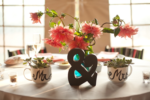 These big coffee cups were another purchase from Michaels and after a little paint and planting of succulents from Mom’s garden, they were ready for our table! The giant dahlias were also grown with love by my lovely Mom just for our big day!