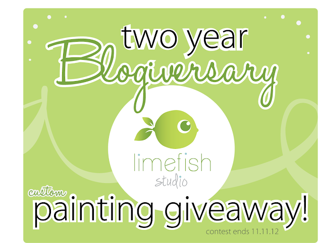 Last year around this time I announced that my little blog (entitled dm designs at the time) had turned one, and I was thrilled that my visitiation had surpassed 100,000! Now, celebrating two years, I finally feel this site has taken shape! I still have lots of plans for improving, but am super pleased with how the last year went. I completely re-branded my business to limefish studio, polished my online shop to include more custom artwork, expanded my global reach, refreshed the look of my portfolio, and expanded my photography. My blog visitation has now surpassed 715,500! Pinterest has become a very helpful marketing assistant — selling one of my paintings in 8 minutes and allowing my 2011 Ultimate DIY Gift Guide to circulate 15,000+ times… woah (heads up a new guide is coming very soon!). And, of course the most exciting news came in August 2012, when I was finally able to take the leap and make freelance art my full time job! Without your interest, without your orders, your referrals, your facebook posts, your tweets, your likes, your pins, and your overall support, this would not have been possible. So, from the bottom of my heart I extend a gigantic THANK YOU! As a small token of my appreciation, I present my Two Year Blogiversary Custom Painting Giveaway!!